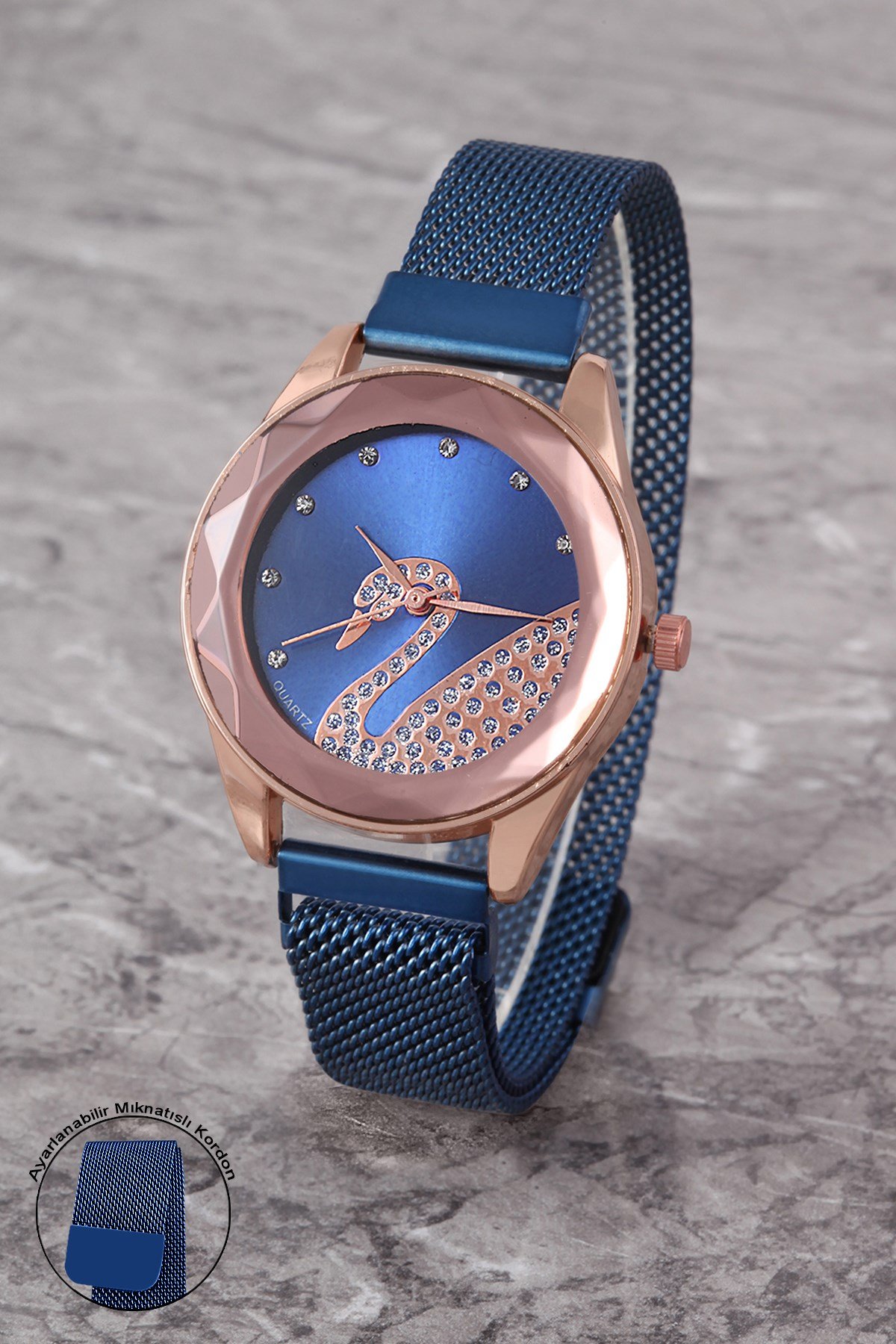 PLKHM003R02 Taşlı Kuğu Desenli Kadran, Prizma Cam,Hasır Örme Mıknatıslı Kordon, Kadın LACİVERT Kol Saati (PLKHM003R02)
