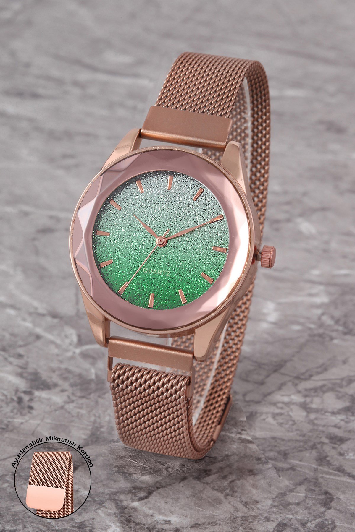 PLKHM004R05 Simli Parlak Kadran,Prizma Cam,Hasır Örme Mıknatıslı Kordon, Kadın YEŞİL Kol Saati