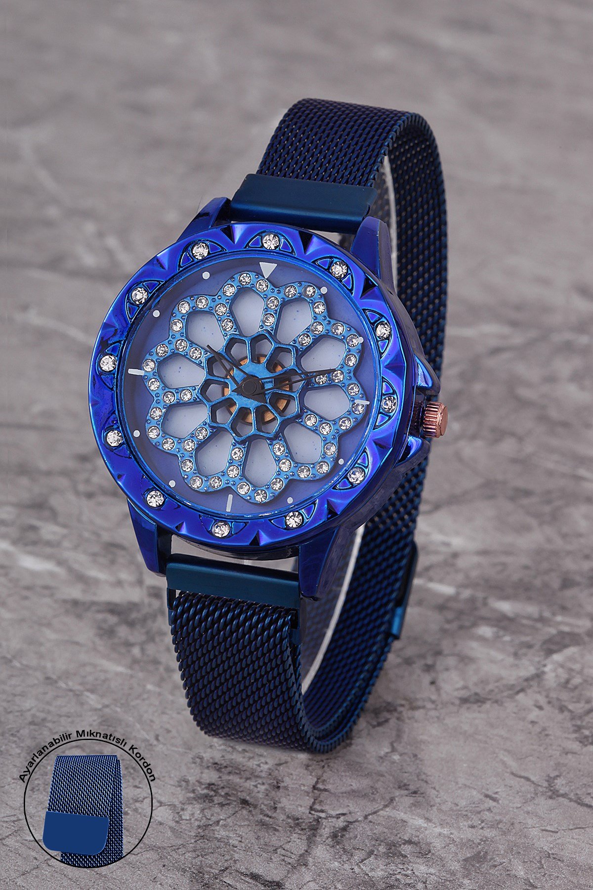 PLKHM007R04 KADIN SAAT TAŞLI OYNAR ÇİÇEKLİ KADRAN MIKNATISLI HASIR KORDON