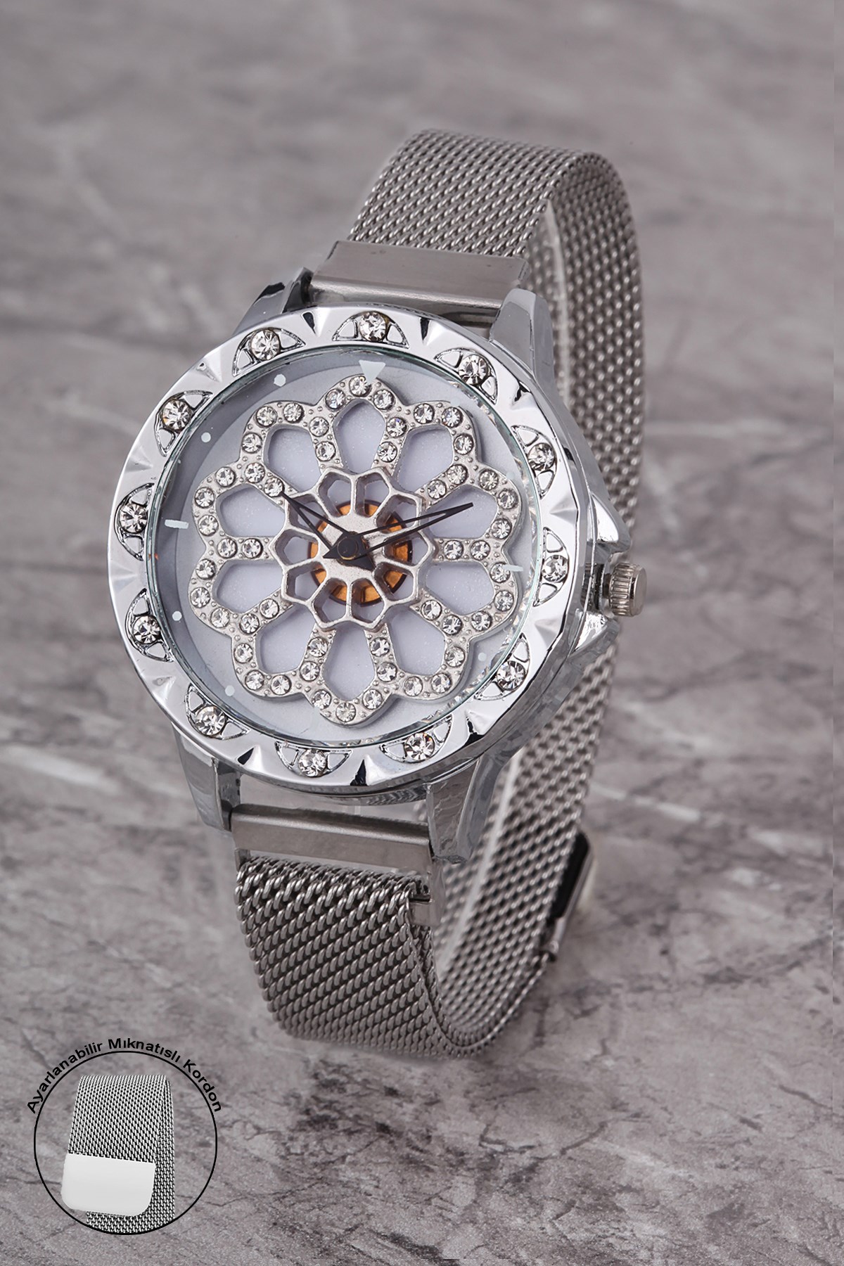 PLKHM007R06 KADIN SAAT TAŞLI OYNAR ÇİÇEKLİ KADRAN MIKNATISLI HASIR KORDON