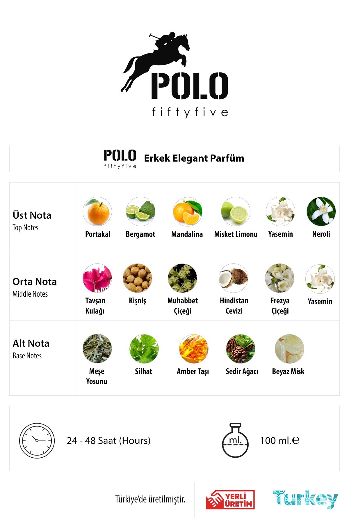 Üst Nota: Portakal, Bergamot, Mandalina, Misket Limonu, Yasamin, Neroli